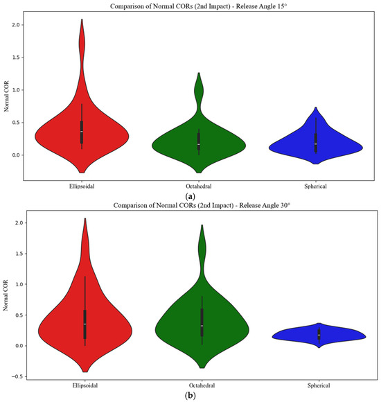 The normal COR distribution during the second impact for different shapes at the release angles of (a) 15° and (b) 30°.