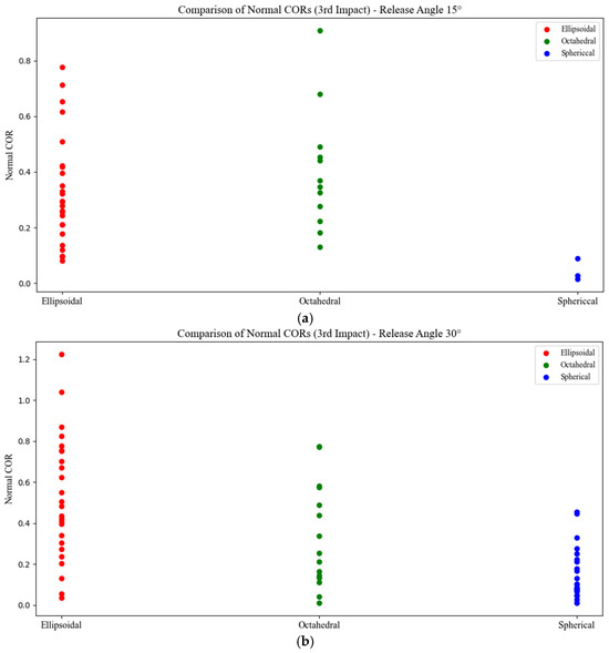 The scatter plots showcasing the normal COR values after the third impact for different shapes at the release angles of (a) 15° and (b) 30°.