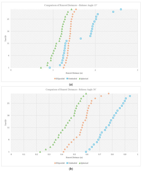 The comparison of runout distances for different shapes at the release angles of (a) 15° and (b) 30°.