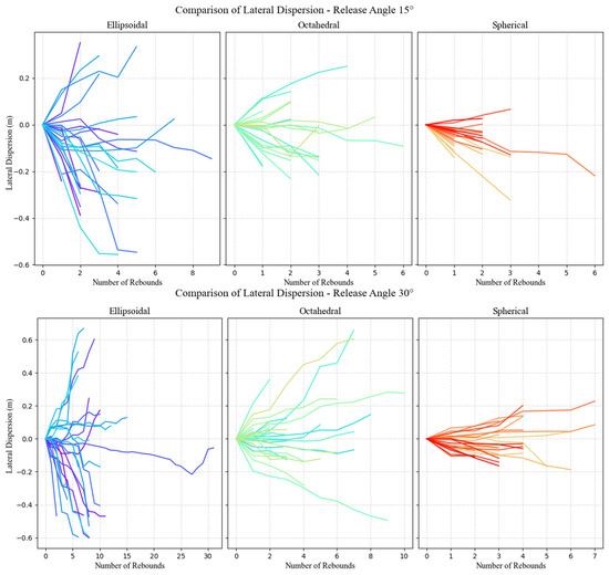 At a 30° release angle, ellipsoidal samples exhibited the greatest degree of scatter, with lateral dispersions ranging from −0.6 to 0.6 m. This broad spread highlights the inherent instability of the ellipsoidal shape upon impact, where even slight variations in contact points or rotational motion can produce significantly different outcomes. Octahedral samples also demonstrated chaotic tendencies, though their dispersion was somewhat less extreme compared to the ellipsoidal rocks.