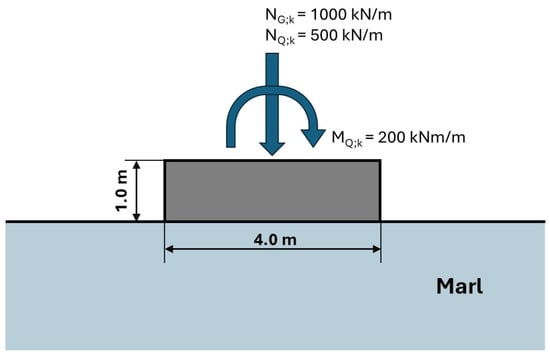 Section 2 provides a detailed overview of the relevant sections of Eurocode 7 pertaining to the design of spread foundations on rock masses. These provisions form the basis for the calculations and verifications developed in the subsequent sections. Section 3 introduces the case study—a strip spread foundation on a rock mass—describing its geometry, the applied actions, and the ground properties. This section also outlines the methodologies used for safety verification by means of deterministic, semi-probabilistic, and probabilistic approaches, using the Hoek–Brown and the Mohr–Coulomb failure envelopes. Section 4 explains how the fundamental input parameters required for each verification approach are obtained, including data related to actions, geometry, and ground conditions. Section 5 presents the verification of the bearing failure limit state using the three approaches, along with a comparative analysis of the results. Section 6 discusses the rationale behind the choices made, the procedures adopted, and the results obtained. Finally, Section 7 summarizes the main conclusions of the study.