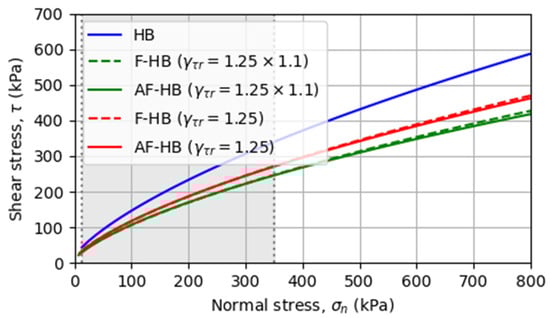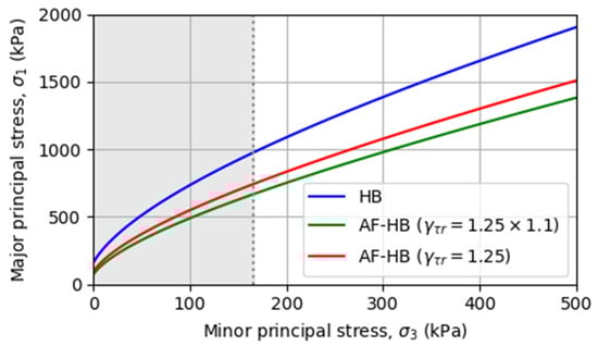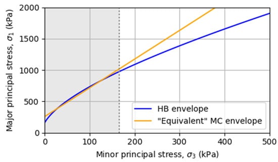 When compared to the values of the bearing resistance computed using the Mohr–Coulomb model, a decrease in resistance is observed. This is a consequence of the linearization process, with the “equivalent” Mohr–Coulomb model slightly overestimating the major principal stress below the foundation σ1A for a value of the principal minor stress of σ3A (see Figure 3).