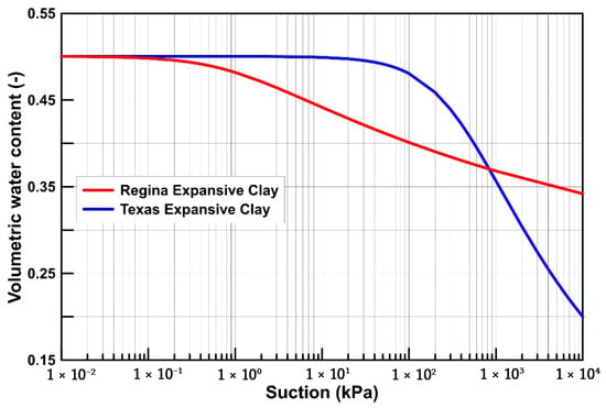 To compute effective stress, the parameters α and n (as per Equation (9)) must first be determined. This was accomplished by fitting van Genuchten’s equation [] to the SWCC data for each soil. RETC software (Version: 6.01, PC-Progress, Groton, MA, USA) [] was used to obtain soil–water characteristic parameters for both expansive clays, as summarized in Table 2.