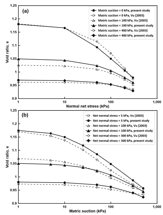 Void ratio constitutive curves for Regina clay: (a) void ratio versus net normal stress at various matric suctions; (b) void ratio versus matric suction at various net normal stresses. Comparison of this study with data from Vu [].