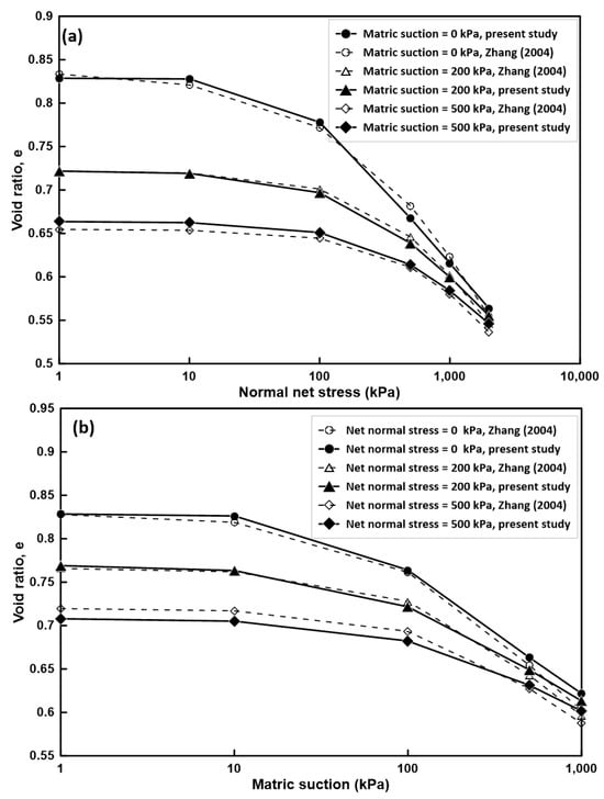 Void ratio constitutive curves for Texas clay: (a) void ratio versus net normal stress at various matric suctions; (b) void ratio versus matric suction at various net normal stresses. Comparison of this study with data from Zhang [].