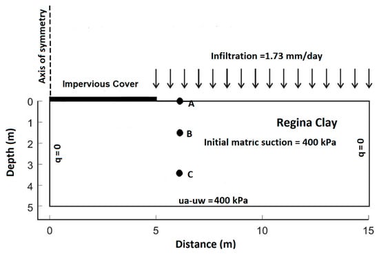 These values were obtained from the best-fit power low curve matched to the calculated elastic modulus versus soil moisture data for the range of matric suction between 0 and 400 kPa. It should be noted that the saturated elastic modulus for Regina clay, as estimated by Adem [], is 1.1 MPa, which is greater than the value used in this study. Table 5 presents the physical parameters used for Regina clay in this study.