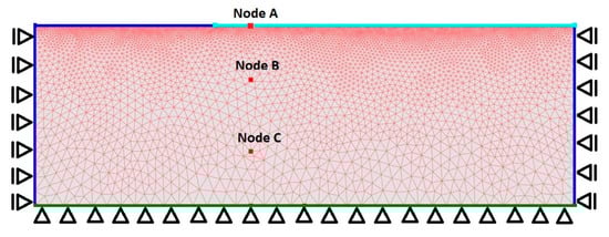 Figure 10a,b illustrate the comparison of predicted matric suction and heave at the three locations (nodes A, B, and C) over time using the developed numerical model and the results obtained by [] using a coupled approach. The observation nodes A, B, and C are located 1 m away from the paved area at depths of 0, 1.5 m and 3.5 m, respectively. Although the anticipated matric suction at node C is approximately 20% less than that reported by [], the matric suction compares well at shallower depths (nodes A and B).