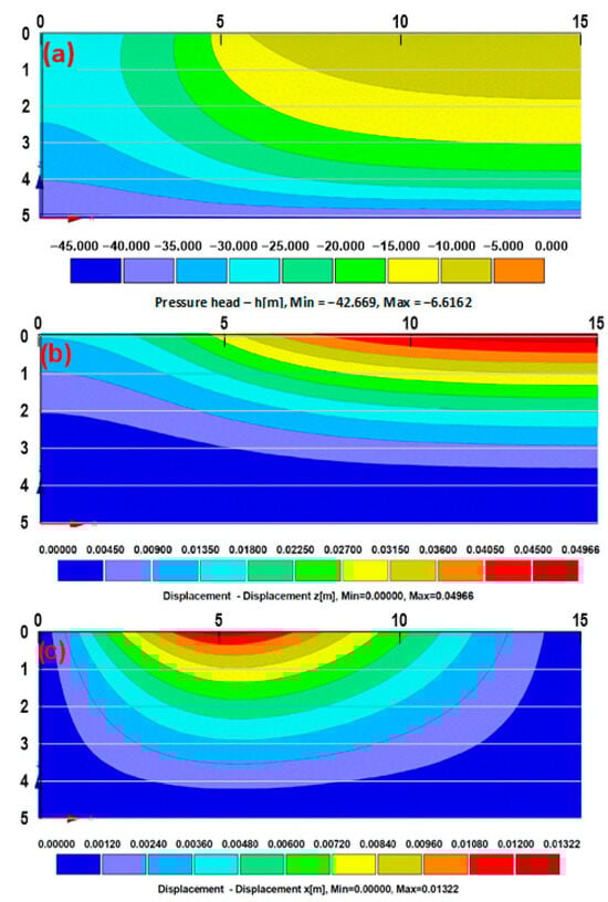 Figure 9a–c illustrate the distribution of the matric suction head and vertical and horizontal deformations at the day 175. The infiltration process led to a reduction in matric suction from its initial value of 400 kPa (40.78 m) to approximately 6 m near the unpaved ground surface. As expected, this decrease in matric suction resulted in soil heaving. After 175 days, the maximum heave reached approximately 50 mm, occurring at the farthest right side of the domain along the ground surface. In addition to heaving, the asymmetric infiltration conditions induced lateral movements in the expansive soil. The numerical results indicate that the maximum horizontal deformation at the corner of the paved area is approximately 13 mm. These findings, when compared to those reported by Vu [] in Figures 6.84, 6.89, and 6.90, show good agreement. For example, the maximum and minimum vertical displacement values of 50 mm and 10 mm, respectively, are consistent in both studies. Similarly, the distribution of horizontal displacement magnitude and its location are also very similar.