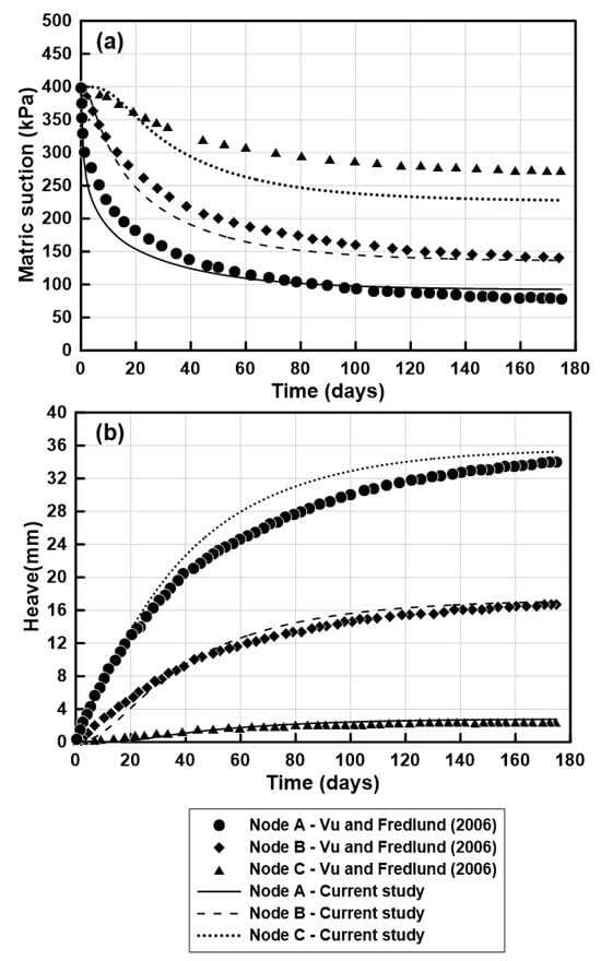 (a) Matric suction development with time at points A, B, and C; (b) vertical displacement (heave) with time at points A, B, and C. Comparison of this study with data from Vu and Fredlund [].