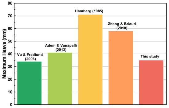 Maximum heave at node A after day 175. Comparison of this study with Vu and Fredlund [], Adam and Vanapalli [], Hamberg [], Zhang and Briaud [].