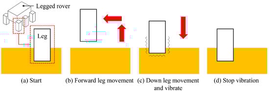 - Watanabe, T.; Iizuka, K. Proposal of walking to reduce slipping behavior using the compaction effect of loose soil caused by propagation of vibration for small light lunar planetary exploration rovers with legs. Trans. JSME 2020, 86. [Google Scholar] [CrossRef]