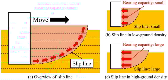 Building on this understanding, we developed a coordinated walking pattern combining leg motions with timed vibrations to enhance ground reaction forces and minimize slippage. The proposed gait sequence is illustrated in Figure 2. Initially, the leg advances (Figure 2b). Upon ground contact, vibrations are activated (Figure 2c), softening the soil and allowing the leg to penetrate more easily. Subsequently, vibrations are halted to allow soil compaction and density increase (Figure 2d). This compaction results in an increased bearing capacity on the leg due to greater leg sinkage and denser ground, which expands the slip line—the interface separating moving soil particles influenced by the leg from stationary particles (Figure 3a). A longer slip line corresponds to stronger bearing capacity against the leg, as shown in Figure 3b,c. Prior research confirms that slip line length grows with increased leg penetration and soil density [,]. To validate this approach, we conducted experiments with a legged prototype traversing inclined loose soil surfaces. Comparative tests between walking with and without vibration demonstrated notable improvements in traversal distance, confirming the efficacy of the vibration-assisted gait.