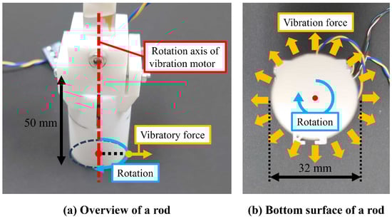 Figure 5a illustrates the experimental apparatus, comprising a vacuum chamber, a test setup, and a vacuum pump. A more detailed view of the test setup is presented in Figure 5b, which includes a soil container, a cylindrical rod, and a force measurement sensor. The dimensions of the soil container were 90 mm in length, 150 mm in width, and 70 mm in height. The rod was dragged along the container’s longitudinal axis. The soil used in the test bed consisted of Silica No. 5 and Toyoura sand, both of which are widely used in research related to extraterrestrial robotic mobility. The physical properties of these materials are summarized in Table 1. The cylindrical rod used for the test (shown in Figure 6) had a diameter of 32 mm and was modeled based on prior studies involving legged rovers for planetary exploration [,,]. The vibration mechanism embedded in the rod included a DC motor (TP-2528C-24, Three Peace Co., Ltd.), which produced vibration through rotation of an eccentrically mounted mass. The resulting oscillatory force was tangential to the motor’s rotational path, as depicted in Figure 6. For the experiment, the motor operated at 30 V, producing a vibrational force of approximately 11.9 N at a frequency of 233 Hz. A summary of the test setup is provided in Table 2.