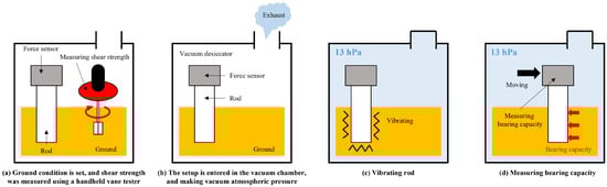 The procedure for measuring bearing capacity is outlined in Figure 7. The soil surface was first homogenized and leveled, after which the rod was inserted into the soil to a depth of 30 mm. Prior to testing, shear strength was measured using a handheld vane tester to assess initial ground conditions. This value served as an indicator of compaction and bulk density, and the target shear strength was maintained between 0.30 and 0.60 cN·m. If the measured shear strength fell outside this range, the soil was remixed. Following ground preparation, the chamber was evacuated to a pressure of 13 hPa. After reaching the desired vacuum condition, vibration was applied to the rod in the horizontal (xy-plane) direction for 30 s. Upon cessation of vibration, the rod was dragged through the soil at a constant speed of 1.67 mm/s for another 30 s, during which the force sensor recorded the reaction force from the ground. This test was performed under both standard and low-atmosphere conditions, with five repetitions conducted for each experimental condition. The experimental conditions are provided in Table 3.