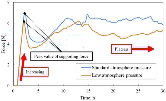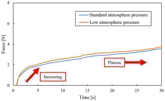Here, n is the amount of measured bearing capacity data from the start to the end of the time that the rod was dragged. and are the values of the bearing capacity under standard atmospheric pressure and under low atmospheric pressure when the data number was i. A lower RMSE value indicates a higher degree of agreement in the change in bearing capacity during traction between standard-atmosphere and low-atmosphere conditions.