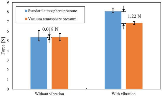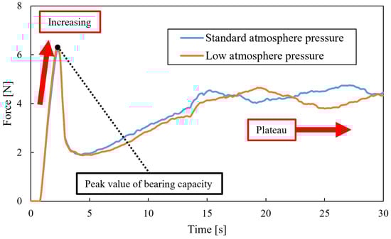 Figure 10 presents the peak bearing capacities recorded under each condition, with associated standard errors derived from five replicates. Across all pressure conditions, the application of vibration consistently led to higher peak bearing capacities compared to tests without vibration. A comparison between standard and low-atmospheric conditions reveals a difference of 0.23 N in the no-vibration case and 0.31 N when vibration was applied. Given the small magnitude of these differences, it can be inferred that the atmospheric pressure has minimal effect on the enhancement of bearing capacity through vibration.