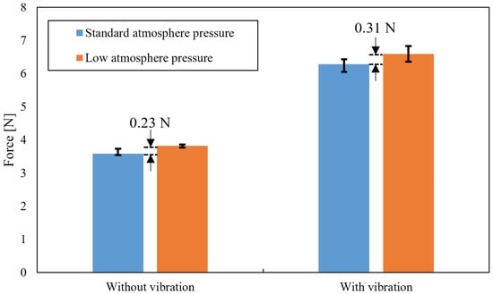 The RMSE values under each condition are presented in Table 5. Without vibration, the RMSE was 0.197 N, whereas with vibration, it increased to 0.898 N. The lower RMSE value in the non-vibration condition indicates that there was minimal difference in bearing capacity during traction between the standard and low-atmospheric conditions. In contrast, the higher RMSE observed under the vibration condition suggests that the application of vibration caused a variation in bearing capacity due to the low-atmospheric environment.