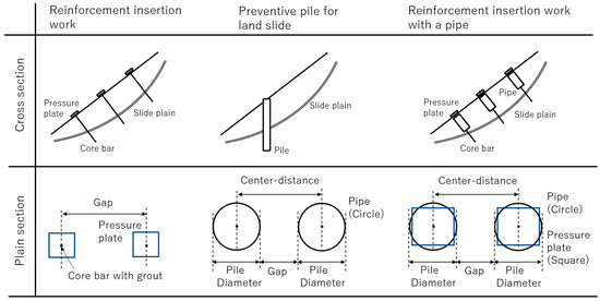 Figure 1 shows two existing construction methods (left and middle) along with a novel method proposed in this paper (right). The first of the existing construction methods, namely the reinforcing bar insertion method, uses the tensile force of the core bar to integrate multiple core bars and pressure plates into the soil, thereby increasing the stability of the slope. The provision of reduced spacing between the core bars (referred to as a “gap” here) is considered to prevent the soil from passing through the gap and increase the effectiveness of the countermeasure. In the second existing construction method, namely the landslide deterrence pile method, steel or concrete piles are constructed below the slope, with the rigidity of the piles being used to resist slope sliding [26,27,28,29]. Here, a larger pile diameter results in higher rigidity and a smaller gap, thereby increasing the effectiveness of the countermeasure. However, the cost in terms of construction and materials would increase as well.