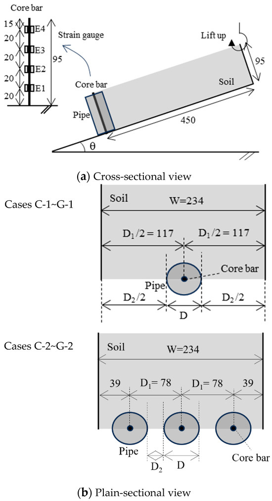 Figure 2a,b present the cross-sectional and plain-sectional views of the model experimental setup, along with relevant dimensions, respectively. The model was built to approximately 1/10 the actual scale, using a stainless-steel box in one gravity field. No.7 silica sand with a soil particle density of 2.63 g/cm3, a uniform coefficient of 2.1, and water content of 15% was used. The friction angle of 33° and cohesion of 15 kN/m2 were gained from a previously conducted direct shear test. The sandbox had a length, thickness (height), and width of 450, 95, and 234 mm, respectively. Stainless-steel bars with a length, thickness, and width of 100, 3, and 5 mm, respectively, were used as core bars. Circular acrylic pipes with a length of 100 mm and different diameters were used for each case.