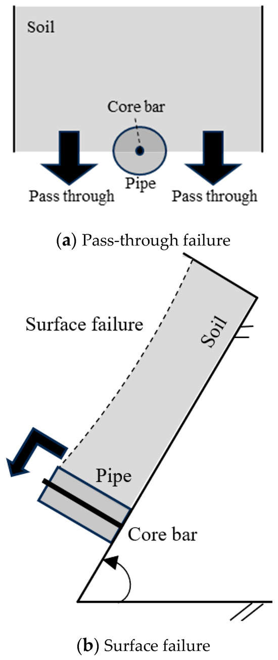 Even though both the aforementioned methods are effective against slope failure and are widely applied, considering their limitations, the author proposes a reinforcing bar insertion method, which uses three pipes, as shown in Figure 1 (right). The pipes increase the apparent diameter of the core bar and reduce the gap, which is expected to prevent soil from passing through the gap. The pipes are simply placed around the core bar, and no grout or other materials are used to fix them in place. Furthermore, they are not embedded in the immovable layer or connected to the reinforcing bar insertion work. Therefore, since the pipes do not require excessive length and the connecting work to other components can be omitted, simplified and economical construction becomes possible, making the method potentially applicable to a wide range of slope structures [30,31].