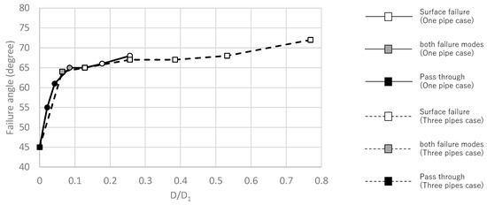 Based on the above results, the relationship between the ratio (D/D1) and the failure angle is shown in Figure 4. The solid and dotted lines indicate one countermeasure (Cases B-1 to G-1) and three countermeasures (Cases B-2 to G-2), respectively. The black plotlines indicate that the slope slipped between the countermeasures, while the white plotlines indicate that the surface sand failed and fell through. The gray plots indicate that the two failure modes occurred simultaneously. From Figure 4, the more the ratio (D/D1) became, the more the angle became. This indicates that, the larger the pipe size and the greater the number of countermeasures became, the more effectively the countermeasures prevent the slope from failure. The soil passed between the gaps at a D/D1 value of less than 0.085.