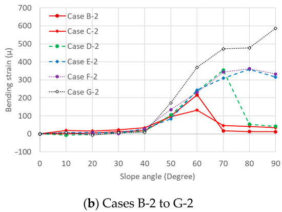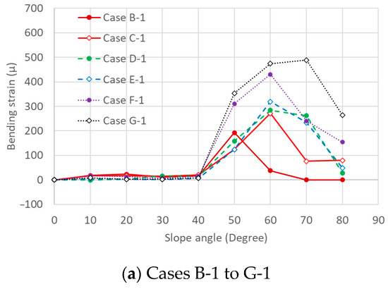The bending strain of the core bar at E1 for Cases B-1 to G-1 and Cases B-2 to G-2 by the slope angle of 10°, as shown in Figure 5a,b, respectively. The experiment was conducted multiple times, and the error in bending strain remained within approximately 10%. The bending strain gradually increased up to an angle of 40°; however, the increase was considerably small. This is because, as the slope was static and had no failure, it did not apply its load to the countermeasures significantly. The bending strain increased from 40° to 50° in each case. This is because, as the slope slipped at 46° without countermeasures for Case A, the load was applied to the core bar owing to a slope of more than 46°. The bending strain increased up to the maximum angle in each case. The larger the pipe size, the greater the number of countermeasures, and the greater the maximum bending strain. This is because, as the soil slipped and fell through, more soil was retained behind the countermeasures. A large pipe is effective against slope failure; however, the burden on the core bar would also be large. The bending strain began to decrease after the maximum strain in each case except Case G-2. Although the soil failed and lost at a high angle in almost all cases, almost all of the soil remained behind the countermeasure for Case G-2. When comparing Figure 5a,b, the bending strain in three-countermeasure cases was smaller than that in the one-countermeasure cases at the same angle. This is because the lateral load was distributed into three bars.
