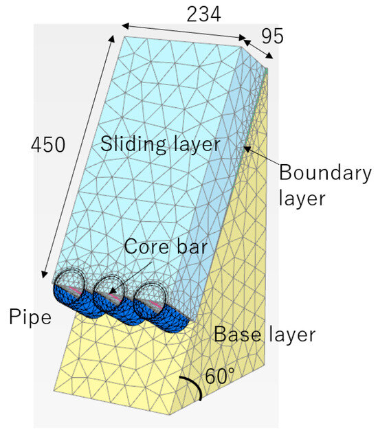 The reproduced analysis targeting the model experiments in the previous chapter utilized the finite element method “PLAXIS3D”. A model diagram of Case G-2, shown in Figure 6, is presented as a representative example of the analysis model, is a three-dimensional model tailored to the dimensions of the model experiments. The input parameters for the analysis (soil, reinforcement bars, and pipes) are listed in Table 2. These parameters were adjusted to match the conditions of the model experiments described in the previous chapter. The Young’s modulus, friction angle, and cohesion of the soil were determined from the results of preliminary direct shear tests. The model represents a structure in which soil placed on a slope inclined at 60 degrees is supported by vertically embedded reinforcement bars, which are surrounded by pipes. The subsurface in the model consists of three layers: a base layer, a sliding layer, and a boundary layer. The base layer is assigned extremely high stiffness and can be regarded as a rigid body. The sliding layer is 95 mm thick, the same as in the experiment. The boundary layer is thin and modeled with low stiffness to simulate slippage. The reinforcement bars are embedded into the base layer, providing conditions close to a fixed end. The pipes are simply placed around the reinforcement bars without a structural connection. The soil is modeled as a linear elastic material, and the Mohr–Coulomb failure criterion is applied. The structural components (reinforcement bars and pipes) are also modeled as linear elastic materials, and material yielding is not taken into account. Interface elements are defined between the pipes and the soil to simulate slippage and detachment.