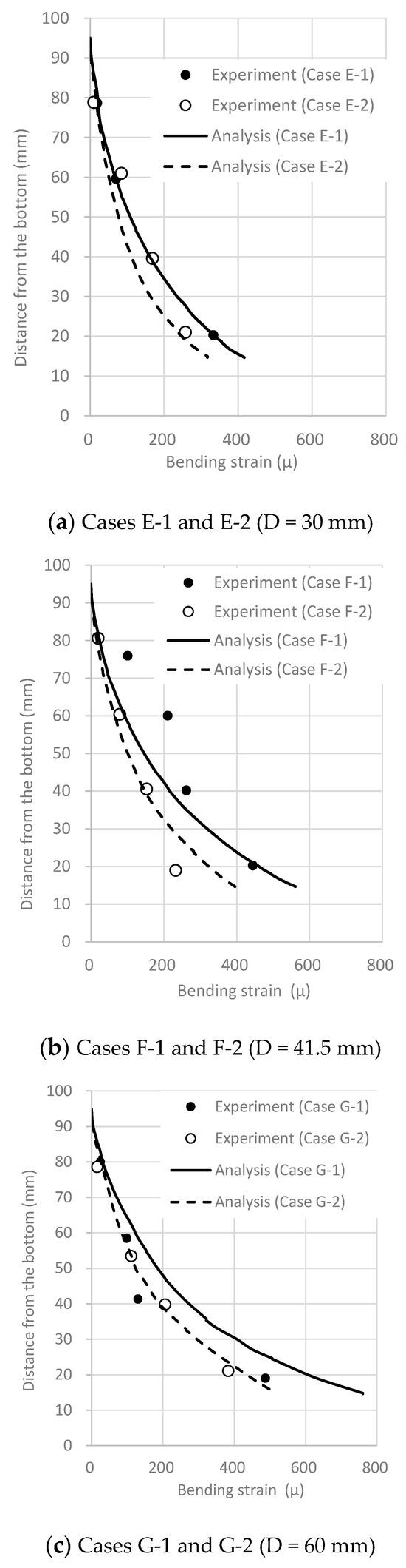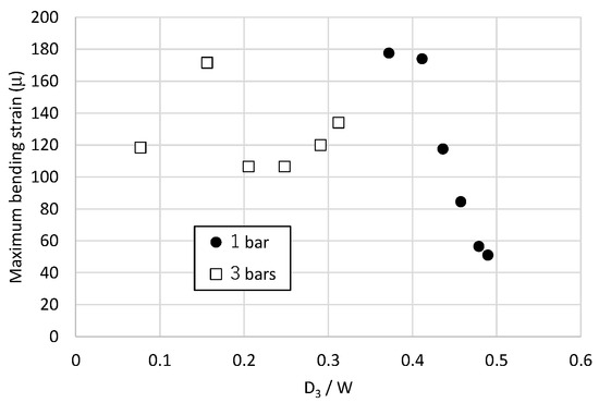 The maximum bending strains at E1 for all the cases (except for Case A) are summarized in Figure 18. Because E1 was closest to the bottom, the maximum bending strain could be measured. The horizontal axis represents the ratio D3/W, and the vertical axis represents the maximum bending strain at E1. The experiment was conducted multiple times, and the error in bending strain remained within approximately 10%.