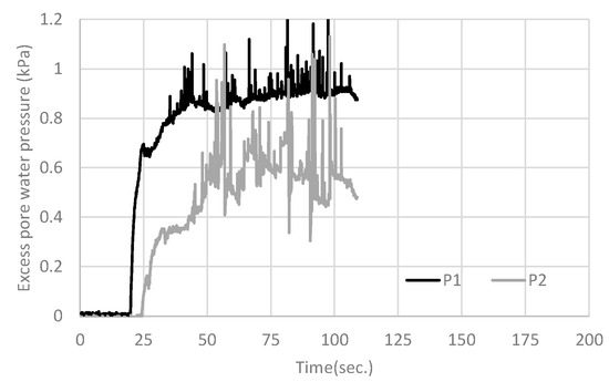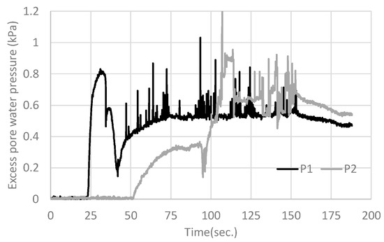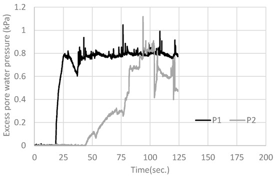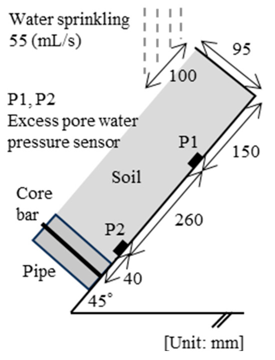 The measurement parameters were time until failure, water volume, pore water pressure, and strain of the core bar. The positions of the excess pore water pressure sensors (P1 and P2) are shown in Figure 8, and strain sensors (E1, E2, E3, and E4) are shown in Figure 2a. The water pressure sensors were put in the center of the width of the box. Three representative cases are discussed in the following section.