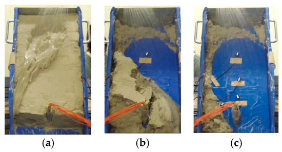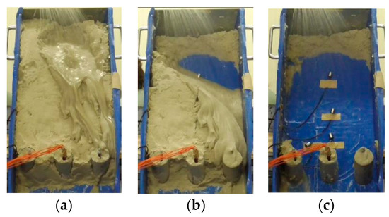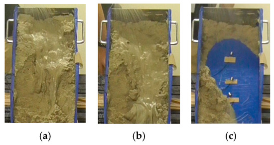 Therefore, the slope slipped as a clump at 50 s, as shown in Figure 9c. Through this experiment, “erosion” and “clump slip” were observed as the two main reasons for slope failure.