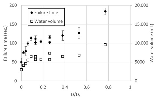 The failure time and water volume for all the cases are summarized in Figure 17. The horizontal axis represents the ratio D/D1, and the vertical axis represents the time and water volume until failure, depicted on a dual axis. Regarding the failure time, since the collapse progresses over several seconds, the margin of error was also indicated in Figure 17. As the pipe diameter and number increased, the time and water volume until failure increased.