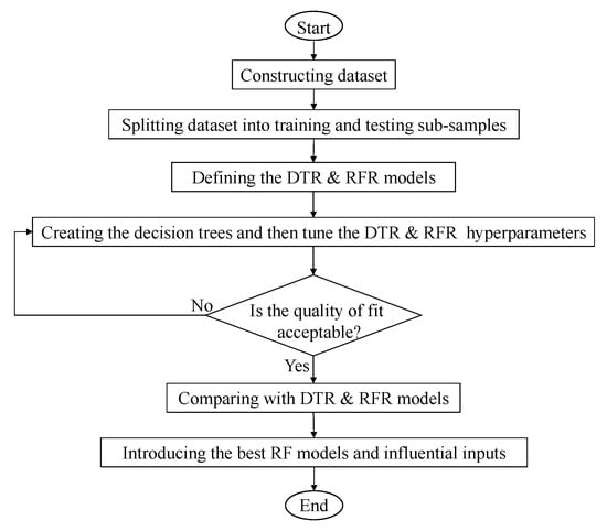 The random forest algorithm operates by constructing multiple decision trees and combining their results through a voting process [,,]. This approach enables the algorithm to provide accurate predictions by aggregating the outputs of individual trees. In the context of random forest regression, the number of trees created for a random vector is increased. The input and output parameters of the tree predictor are treated as numerical values. By generating a random vector of trees and independently constructing each tree using the training dataset, the algorithm calculates the mean squared generalization error [,].