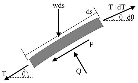 As a result of the chain frictional capacity and second, the angle of the attachment points on the anchor, the soil-chain interaction should be analyzed. To implement the soil-chain interaction effects, Neubecker and Randolph [] used a simplified closed-form solution. According to the model, there is an equilibrium force between the friction force F and the normal soil reaction Q for a segment of the embedded anchor chain, as shown in Figure 3.