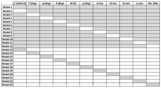 The 11 parameters were selected based on their relevance in the mechanics of anchor–soil interaction, their presence in prior experimental and analytical studies [,], and their representation of both material properties and geometric configuration. The necessity of these parameters was confirmed by feature importance analysis, as their removal was found to degrade model performance.