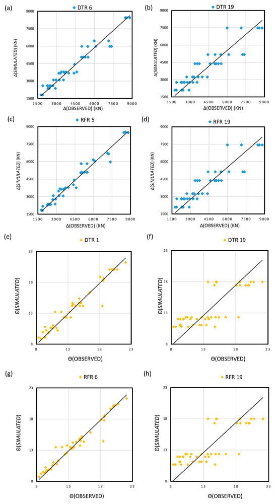 Figure 5 shows the scatter plots for the best DTR and RFR models for modeling the holding capacity and efficiency of the DEAs in the sand seabed. Regarding the modeling results, the superior ML models demonstrated the highest level of correlation in comparison to other ML models. The scatter plots illustrated RFR’s superior predictive capability. For capacity, RFR 5 (Figure 5c) exhibited tight clustering around the 1:1 line, while DTR 19 (Figure 5b) showed dispersion at higher loads. DTR 6 showed strong agreement between simulated and observed capacities using a DTR with 10 input features. Most points are situated close to the diagonal, indicating good prediction accuracy. For efficiency, RFR 6 (Figure 5g) achieved near-perfect alignment, whereas DTR 19 (Figure 5f) underestimated efficiency in low-friction soils. The RFR 6 model provided a good prediction of efficiency, closely following the observed trend.