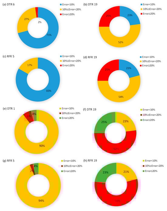 Error analysis plots for (a) capacity predicted by DTR 6 (b) capacity predicted by DTR 19 (c) capacity predicted by RFR 5 (d) capacity predicted by RFR 19 (e) efficiency predicted by DTR 1 (f) efficiency predicted by DTR 19 (g) efficiency predicted by RFR 6 (h) efficiency predicted by RFR 19.