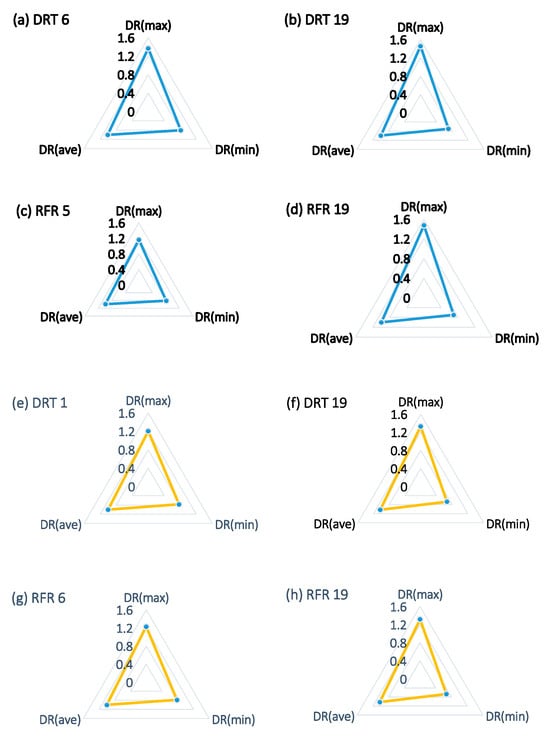 Discrepancy ration analysis plots for (a) capacity predicted by DTR 6 (b) capacity predicted by DTR 19 (c) capacity predicted by RFR 5 (d) capacity predicted by RFR 19 (e) efficiency predicted by DTR 1 (f) efficiency predicted by DTR 19 (g) efficiency predicted by RFR 6 (h) efficiency predicted by RFR 19.