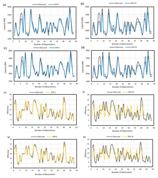 Comparison between observed with (a) capacity predicted by DTR 6 (b) capacity predicted by DTR 19 (c) capacity predicted by RFR 5 (d) capacity predicted by RFR 19 (e) efficiency predicted by DTR 1 (f) efficiency predicted by DTR 19 (g) efficiency predicted by RFR 6 (h) efficiency predicted by RFR 19.