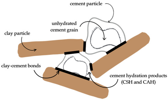 Cement hydration rapidly produces calcium hydroxide and elevates pH, creating an alkaline environment. Subsequently, pozzolanic reactions occur between calcium hydroxide, siliceous and aluminous components from clays, and water.