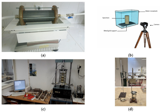 The erosion cell (a), sketch of the Crumb device (b), triaxial automated system (c), and hydraulic conductivity test (d).