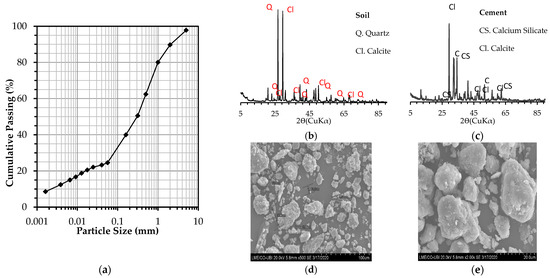 Belmana et al. (2024) [15] conducted a previous characterization of the materials described. Figure 4b,c exposes XRD analyses, which permitted the identification of the essential crystalline phases contained in the materials, and it indicates that the primary crystalline minerals in the soil are quartz (Q) and calcite (Cl). The results showed that the predominant elements present are silica (SiO2), calcium oxide (CaO), and alumina (Al2O3). They also revealed that the primary constituents of the cement were calcite (CaCO3) and quartz (SiO2), due to the use of calcite (CaCO3) and calcium silicate (CS) (Ca3SiO5) in the production of cement. In addition, SEM images of the untreated soil are presented in Figure 4d,e.