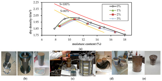 For HET tests, a cylindrical PVC mold measuring 100 mm in diameter and 200 mm in length was used to prepare the soil specimen (Figure 5b). For triaxial tests, a cylindrical copper mold measuring 70 mm in diameter and 140 mm in length was used to prepare the specimen (Figure 5c). To obtain uniform compaction, the soil specimen was dynamically compacted into three layers of equal thickness inside the PVC mold with a Normal Proctor test hammer. The amount of material and the required mixing water content were calculated from the desired final dry density using the standard Proctor curve (Figure 5a). Figure 5d,e illustrate the storage of HET and triaxial specimens, respectively. The specimens prepared to carry out the two tests (HET, Crumb test) have the same characteristics.