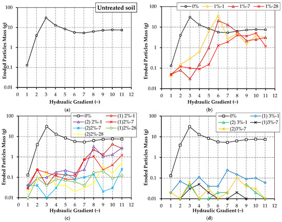 Figure 6a shows that untreated soil begins eroding at a low hydraulic gradient of 1, indicating early internal instability. The mass of eroded particles increases with the hydraulic gradient, peaking at 34.6 g at gradient 3. Beyond this, erosion decreases, reaching 5.33 g at gradient 7 and stabilizing around 7.5 g at higher gradients. This reduction is linked to hole enlargement, which lowers water pressure and shear stress, thus reducing particle detachment.