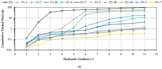 Figure 6c indicates that 2% cement-treated soils show better resistance than 1% treatments, with the maximum eroded mass being only 4.9 g, even at gradient 10 after 24 h. Despite this improvement, the soil remains vulnerable to erosion, even after 28 days of curing. Figure 6d demonstrates that 3% cement-treated soils achieve the highest stability. After just 24 h and 7 days of curing, erosion is minimal (less than 0.01 g) even under a hydraulic gradient of 11. These results confirm that 3% cement is the optimal dosage.