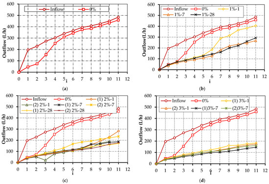 Evolution of the outflow during the charging phase on untreated soil (a), 1% (b), 2% (c), and 3% (d) cement-treated soil.