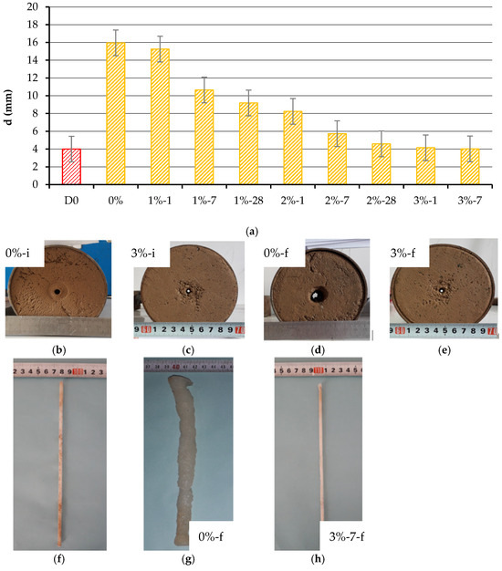 The final diameter of the hole, which is derived from the mean diameter of the extracted paraffine and is shown in Figure 8a as (D0) and Figure 8b–e, can also be used to assess the soil’s resistance to piping erosion. Figure 8b,c shows that the final diameter of the untreated soil is 16 mm. This diameter decreases as the dosage of cement is increased and the curing time is extended, reaching a low value of 4.04 mm (Figure 8d,e), which corresponds to the case of soil treated with 3% cement after 7 days. Additional photographs depicting the final diameter and configuration of the extracted paraffin are presented below in Figure 8f–h.