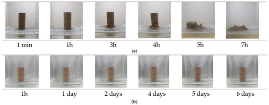The immerged specimen created with untreated soil withstands only 7 h until the full collapse (Figure 9a). It should be emphasized that the detachment of the particles from the solid mass began from the first minutes of the specimen being immersed in water. After approximately one hour of immersion, the disintegration of larger flocs was noted, devoid of the turbidity effect characterized by a halo of suspended particles surrounding the sample, in contrast to the experiments conducted by Elandaloussi [58]; however, this effect was observed after five hours, when the specimen was fully dispersed.