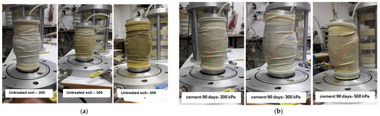 This 3% cement content was identified as optimal for effective soil stabilization against erosion. The mechanical enhancement resulting from this treatment was then evaluated. Figure 10a depicts specimens subjected to the triaxial test for untreated soil, while Figure 10b illustrates specimens subjected to the triaxial test for soil treated with 3% cement, respectively, after 90 days of curing, where a visible shear plane indicates failure behavior.