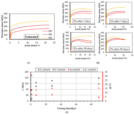 Untreated specimen (a) and 3%-90 days (b) after test, deviator stress versus axial strain for untreated soil (c) and 3% treated soil for 1–90 days of curing (d), and the evolution of cohesion and friction angle versus curing time (e).