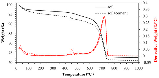 The weight loss rate between 650 and 750 °C is important. This indicates the abundant presence of calcite, CaCO3, in the soil. Matschei et al. [65] disclosed that most, if not all, of this calcite is reactive and controls the lime distribution, alumina, and sulfate, thereby altering the hydration products’ mineralogy. Thus, two main functions are attributed to calcite: the first as an active participant in the hydration process, which may explain the optimum stabilization of soil with the addition of low lime or cement content, and the second as an inert filler.
